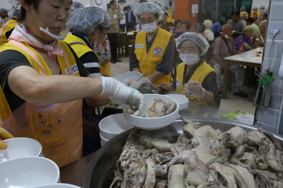 초복인 11일 충북 청주시 서원구 산남종합사회복지관에서 열린 '초복맞이 사랑의 삼계탕 나눔' 행사에서 대한적십자사 충북지사 봉사회원들이 삶은 닭을 그릇에 담고 있다. /배명식기자