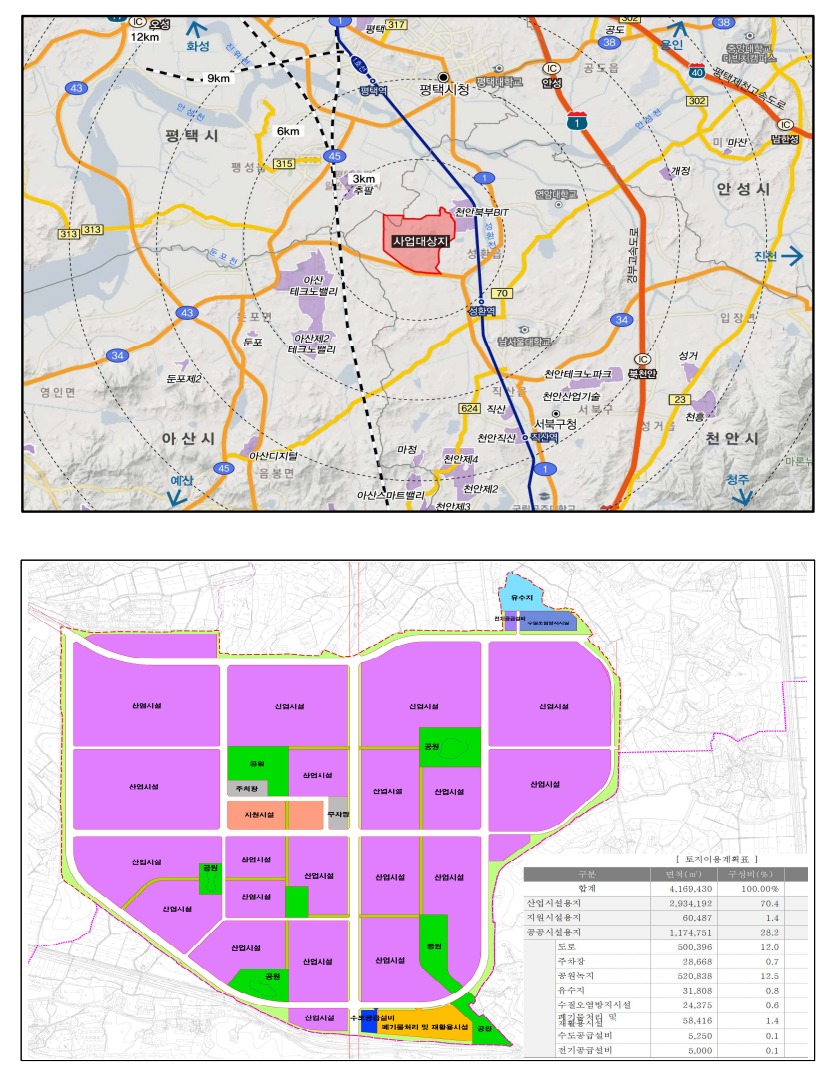 총면적은 417만㎡으로 천안시 서북구 성환읍 신방리 일원 401만 2000㎡와 평택시 팽성읍 노와리 일원 15만 7000㎡이다.