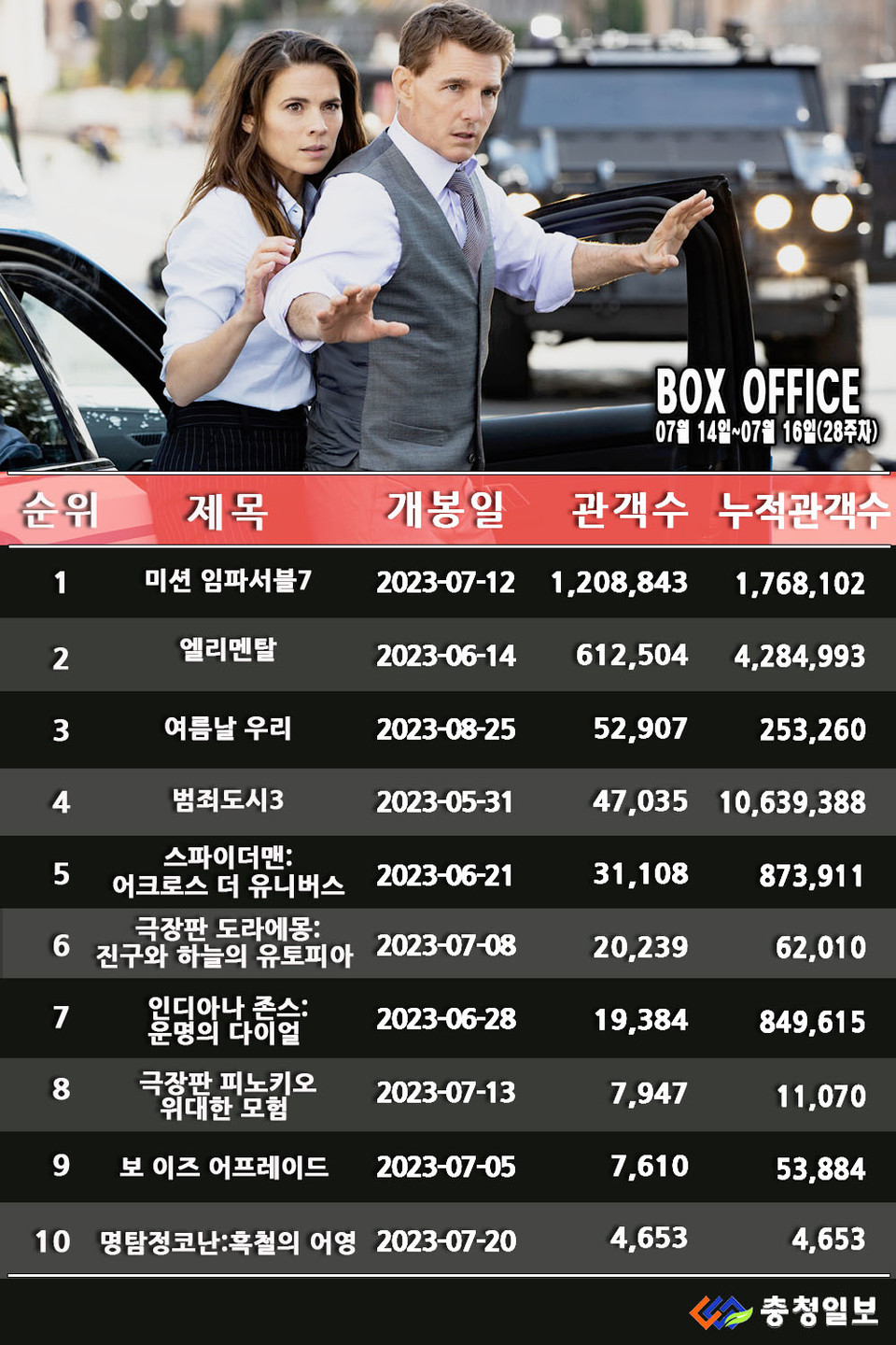 톰 크루즈 주연의 첩보 액션 영화 ‘미션 임파서블: 데드 레코닝 파트 원’(이하 ‘미션 임파서블 7’)이 개봉 첫 주말 극장가 정상에 올랐다.