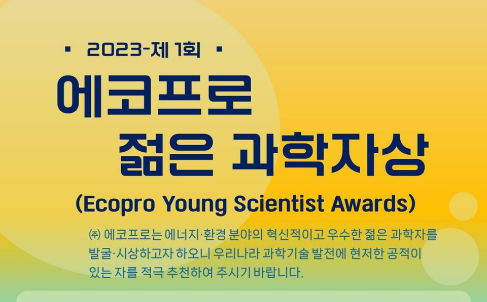 에코프로는 ‘에코프로 젊은 과학자상(Ecopro Young Scientist Awards, EYSA)’을 신설, 오는 9월 15일까지 후보자 추천을 받는다.