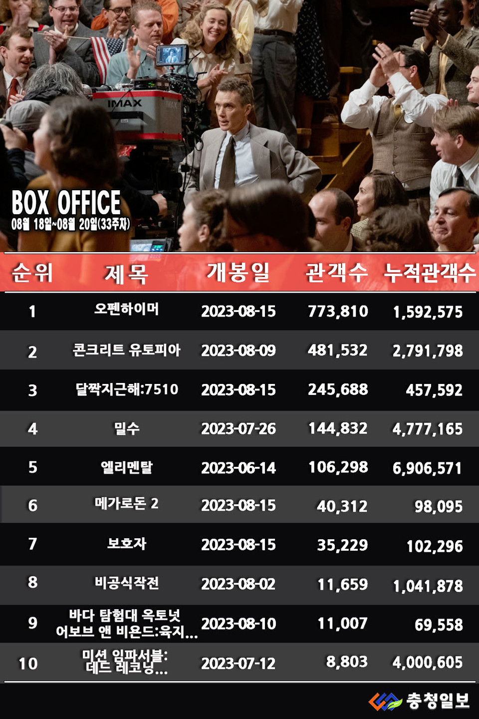 21일 영화관입장권 통합전산망에 따르면 ‘오펜하이머’는 지난 주말(18∼20일) 관객 77만3000여 명을 동원하며 1위를 기록했다. 누적 관객 수는 159만2000여 명이다.