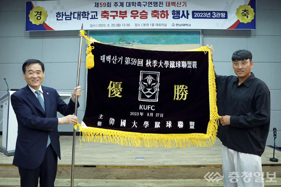 이광섭 총장은 "한 번도 하기 힘든 우승을 올해만 세 번 차지하는 등 한남대 축구부가 감독과 코치, 선수들이 합심해 땀 흘린 노력이 빛을 발하고 있다"며 "10월 전국체전에서도 좋은 성적을 거두길 대학구성원들이 함께 응원하겠다"고 격려했다.
