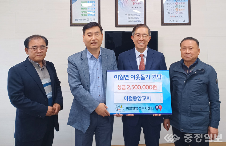 이월중앙교회 김강환 목사가 24일 충북 진천군 이월면 행정복지센터에서 김광진 면장(왼쪽 두 번째)에게 이웃 돕기 성금 250만원을 기탁했다.