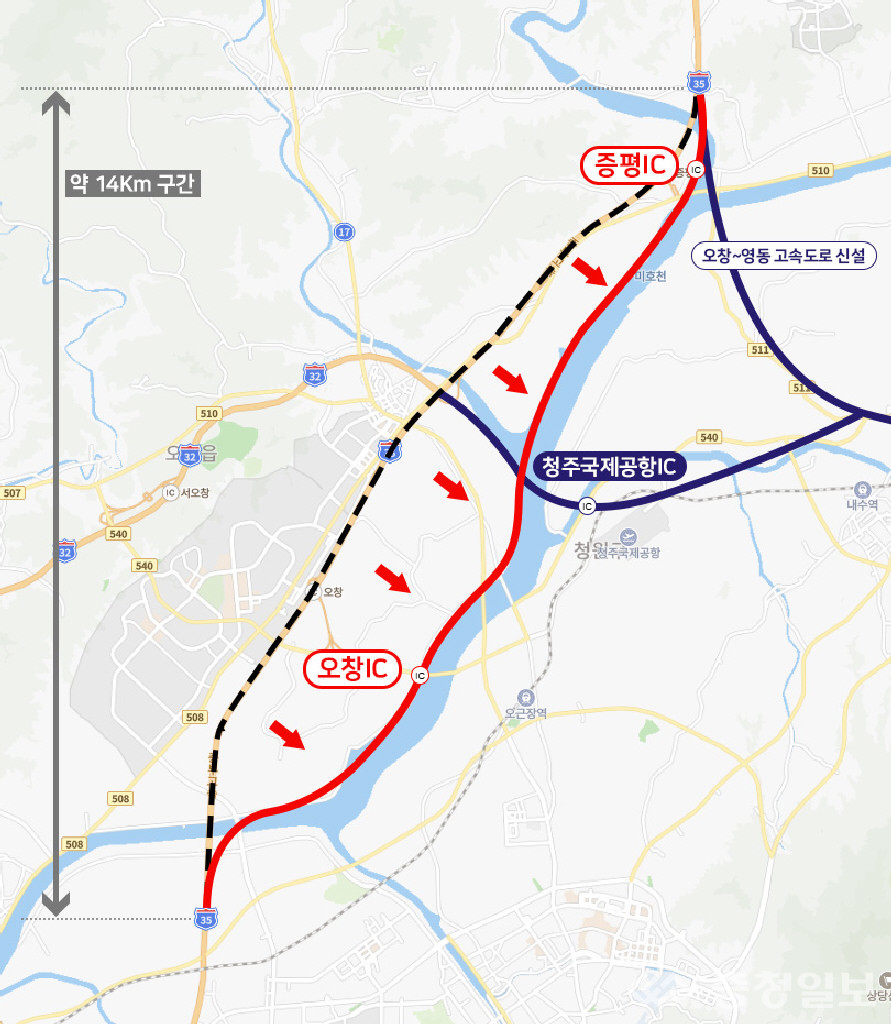 산재한 지역 문제를 해결하기 위한 한 장, 비장의 카드로 중부고속도로 이전 재건설을 생각해본다. 증평IC 지점부터 남서쪽 서청주IC 방향 신평리를 지나 남촌들 앞 미호강을 건너기 전 다리까지 약 14km 구간을, 서울 올림픽대로처럼, 미호강변을 따라, 강 위에 새롭게, 이전 건설하는 방안이다. 단절된 지역을 회복하고, 농지와 산업지, 주거지를 명확하게 구분하여 미래지향적으로 계획 발전시킬 수 있다.