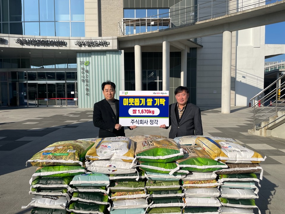 충북 청주시 원봉힐데스하임 시행사인 ㈜정각이 4일 청주시 2임시청사를 방문해 쌀 1670kg을 기탁했다.