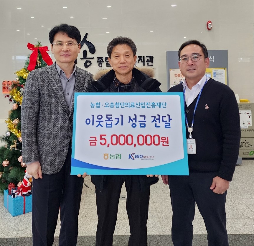 NH농협은행 오송바이오밸리지점(지점장 오병훈)과 오송첨단의료산업진흥재단(이사장 차상훈)은 19일 청주 오송종합사회복지관(관장 유응모)을 방문해 성금 500만원을 전달했다. /김재옥기자