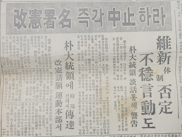 朴 大統領은 또 “이들은 3·4月(월) 危機(위기) 운운하면서 民心(민심)을 불안케 하고 혼란을 더욱 조장할뿐더러 各界(각계) 人士들을 찾아다니면서 소위 改憲請願署名운동을 계속하고 있는 것을 볼 때 言必稱(언필칭) 民主(민주)니 自由(자유)니 하고 國民을 선동하고 다니는 그들의 底意(저의)가 어디에 있느냐 하는 것은 명약관화한 사실”이라고 말했다. <8882호·1974년 1월 1일자 1면>