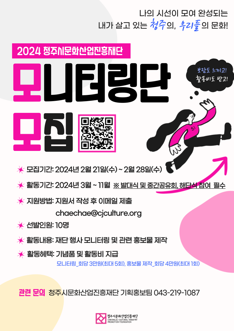 청주시문화산업진흥재단은 2기 시민 모니터링단을 모집한다고 19일 밝혔다.