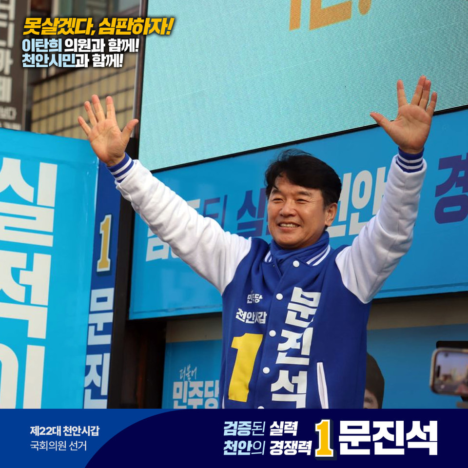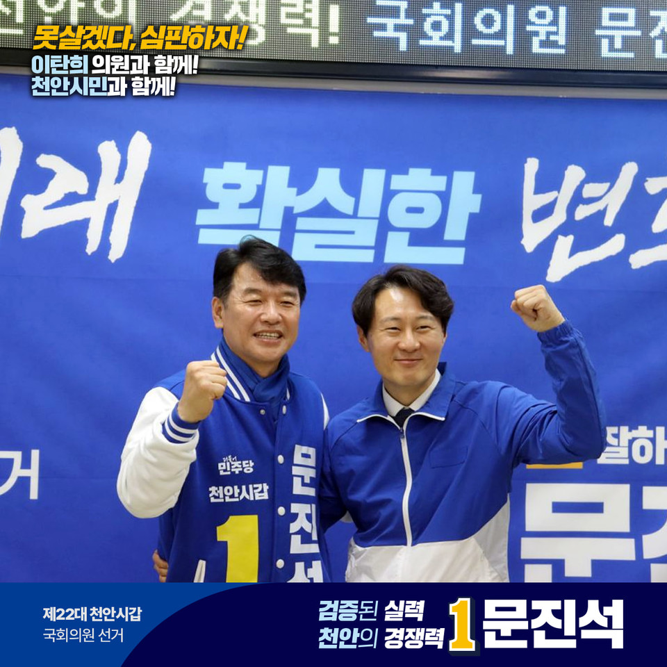 문 후보와 이탄희 의원은 신부동 주변 상가를 돌며 상인들과 시민들을 만나 문진석 후보 지지를 호소했다.