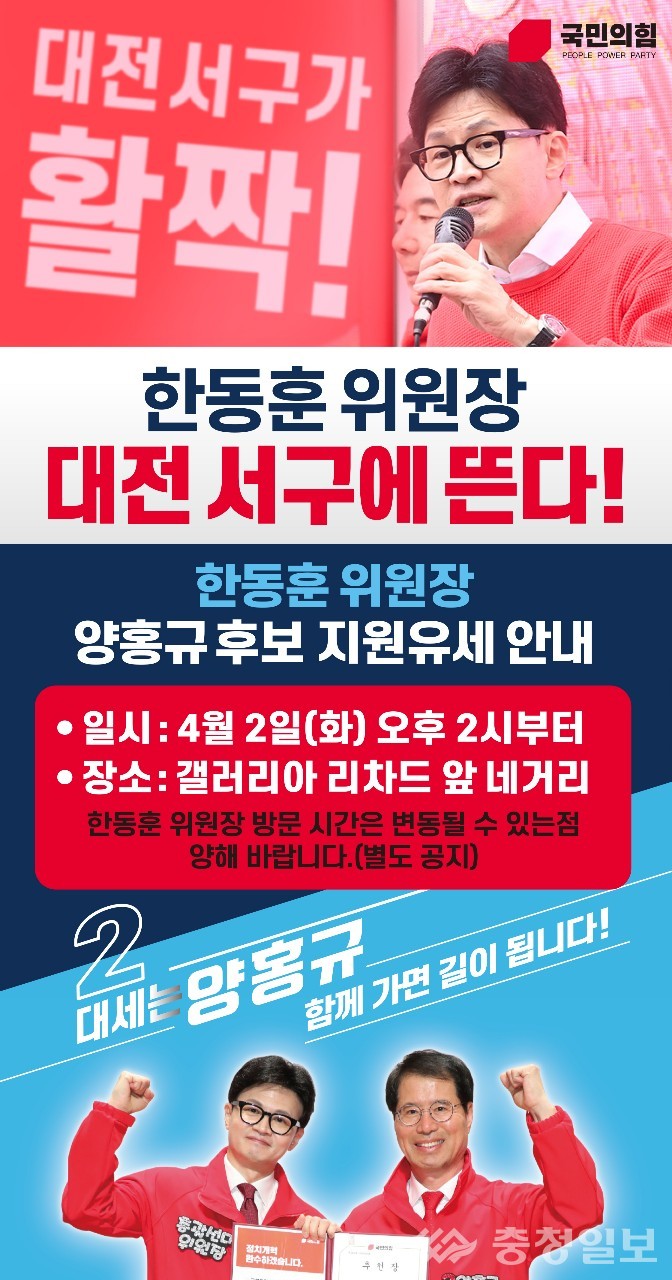 국민의힘 한동훈 위원장이 2일 대전 서구를 방문해 양홍규 후보를 지지하는 지원 유세를 예고했다.