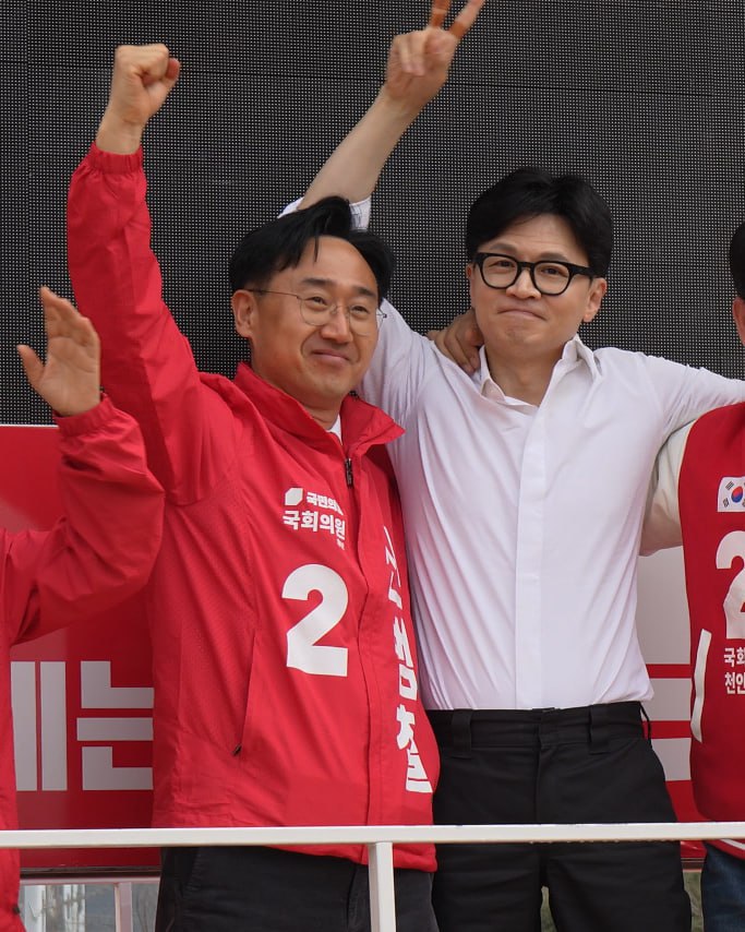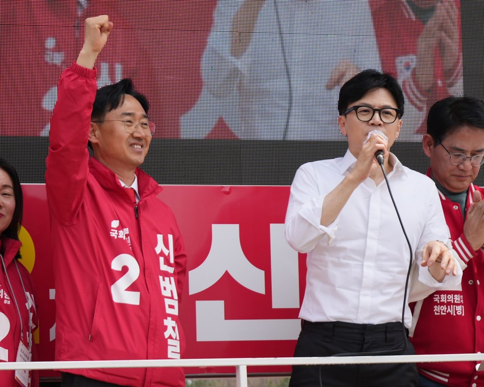 국민의힘 한동훈 총괄선거대책위원장이 2일 천안 동남구 청룡지하차도 사거리에서 열린 '국민의힘으로 천안살리기' 지원유세에서 신범철 천안갑 후보에 대한 지지를 호소했다.