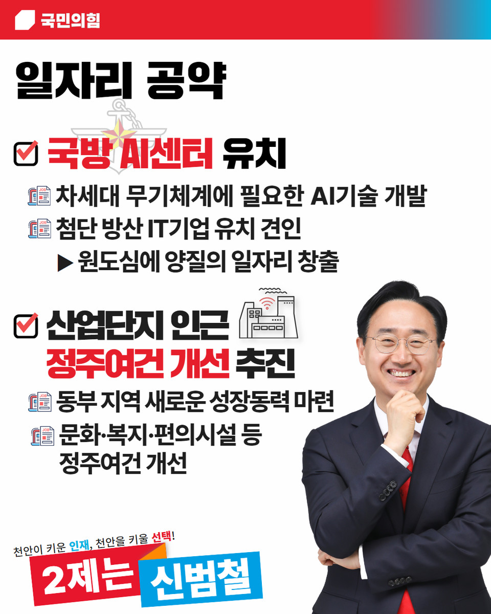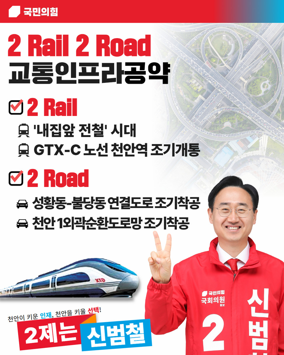 신 후보는 이날 입장문을 통해 2Rail 2Road를 키워드로 설명된 교통인프라 공약으로 △GTX-C 천안역 조기착공 △내 집앞 전철, 신부·성정역, 청수역, 구룡역 신설 △천안1외곽순환도로망 목천-청룡구간 조기 착공 △성황동-불당동 연결도로 조기 착공, 일자리 공약으로 국방 AI센터 유치와 동천안 IC인근 산단과 동면 빙그레 산단을 연계한 기업 유치 및 정주여건 개선 등을 꼽았다.