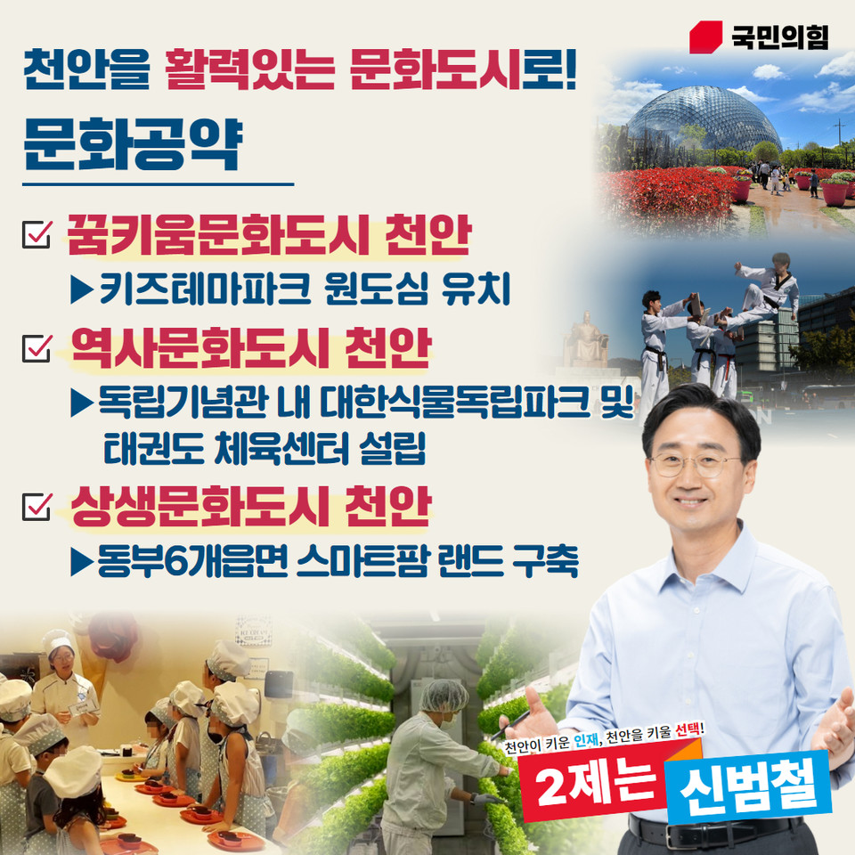 신 후보는 이날 입장문을 통해 문화 공약으로 키즈테마파크 원도심 유치, 독립기념관 內 대한식물독립파크 및 태권도 체육관, 동부6개읍면 스마트팜 랜드 구축을 약속했다.