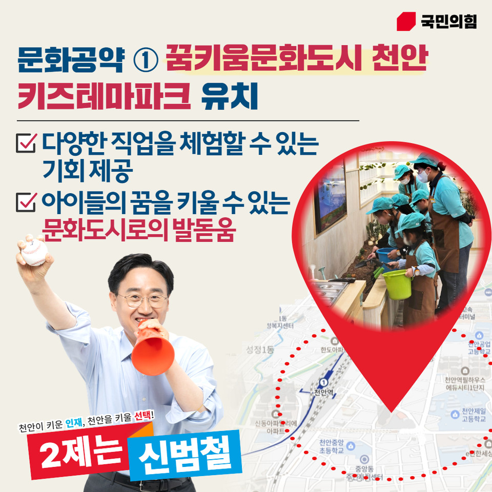 우선 신 후보는 "원도심지역에 직업체험형 키즈테마파크를 유치해 아이들이 다양한 직업체험을 경험하며 건강한 사회인으로 자라나도록 꿈을 키워주는 '꿈키움문화도시 천안'을 만들겠다"고 공약했다.