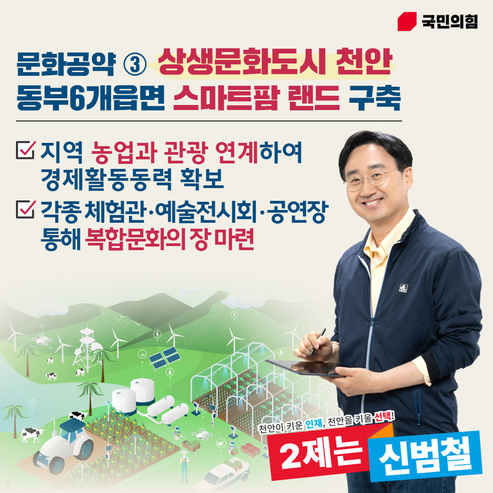 목천, 동면 등 동부 6개읍면 스마트팜 랜드 구축과 관련해서는 "농업과 관광을 연계하여 지역 경제활동동력을 키우는 '상생문화도시 천안'을 만들겠다"며 "스마트팜에서 생산되는 유기농 농산물을 직접 구매할 수 있는 알뜰장 설치를 함께 추진해 지역 경제를 살리는 복합문화의 장을 마련한다"고 강조했다..