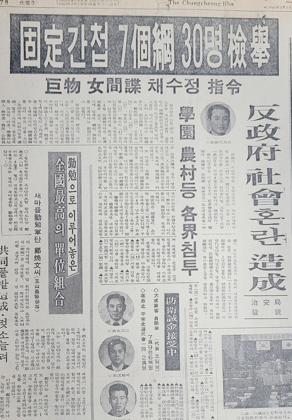 崔錫元(최석원) 치안국장은 6일 오전 9시 북괴 거물 여간첩 蔡洙貞(채수정·49)과 蔡의 지령을 받고 서울·大田(대전)·全州(전주) 등지를 거점으로 암약 중이던 고정간첩 7개 망 一黨(일당) 30명을 지난 4월 모두 검거했다고 發表(발표)했다.