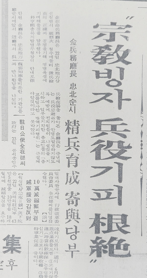 金在命(김재명) 兵務廳長(병무청장)은 22일 忠北地方(충북지방)상설징병서 視察次(시찰차) 청주에 들러 徵兵檢査(징병검사)의 正確(정확)과 공정을 기해 정병육성에 기여해 줄 것을 당부했다.
