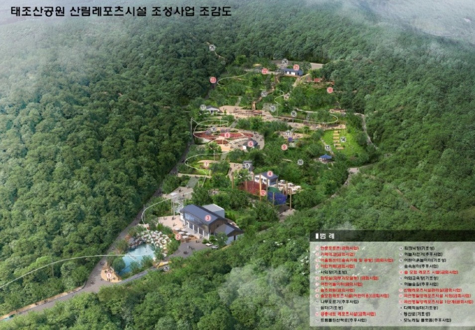 산림레포츠단지는 유량동 인근에 공중네트레포츠 시설과 25개 코스의 숲모험레포츠시설을 조성하고 어울림센터 등의 리모델링을 진행해 천안지역 최대 규모의 산림레포츠 시설을 완성했다.