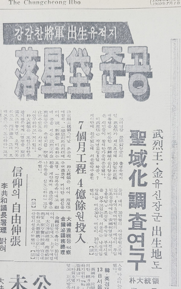 고려명장 姜邯贊(강감찬) 장군의 출생 유적지인 落星垈(낙성대)가 새로 조성돼 10일 朴正熙(박정희) 대통령을 비롯한 양택식 서울시장 등 많은 시민들이 참석한 가운데 준공됐다.