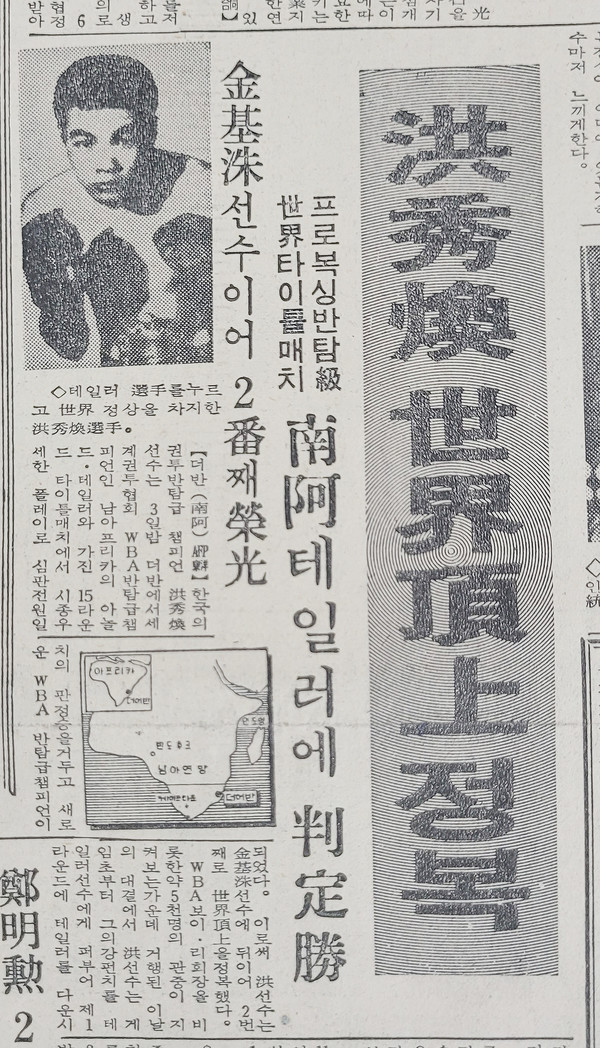 한국의 권투 반탐급 챔피언 洪秀煥(홍수환) 선수는 3일 밤 더반에서 세계권투협회 WBA 반탐급 챔피언인 남아프리카의 아놀드 테일러와 가진 15라운드 타이틀 매치에서 시종 우세한 플레이로 심판 전원일치의 판정승을 거두고 새로운 WBA 반탐급 챔피언이 되었다.
