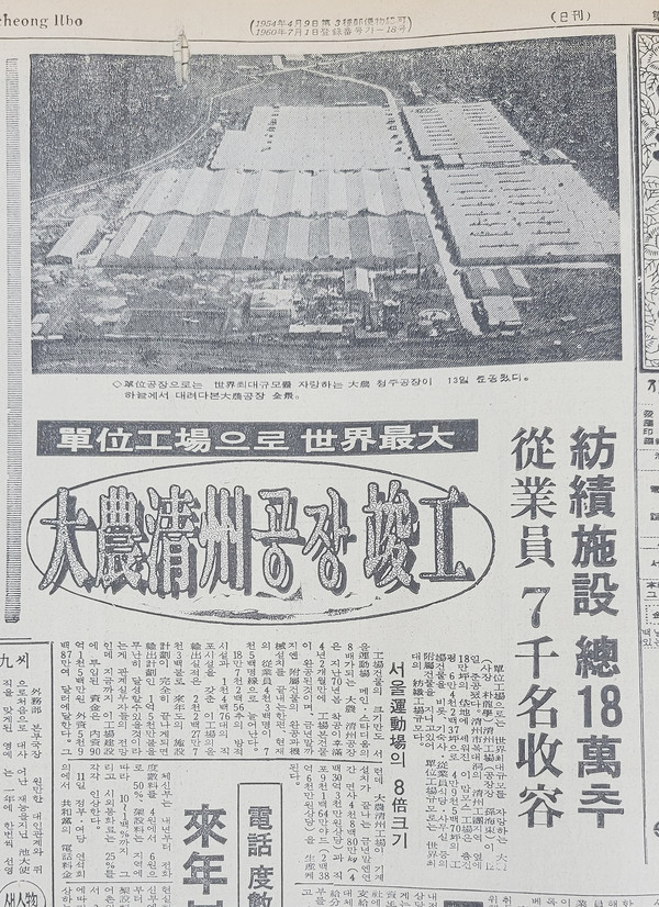 單位工場(단위공장)으로는 世界(세계) 최대 규모를 자랑하는 大農(대농·사장 朴龍學·박용학) 淸州工場(청주공장·공장장 孫海東·손해동)이 12일 준공됐다.