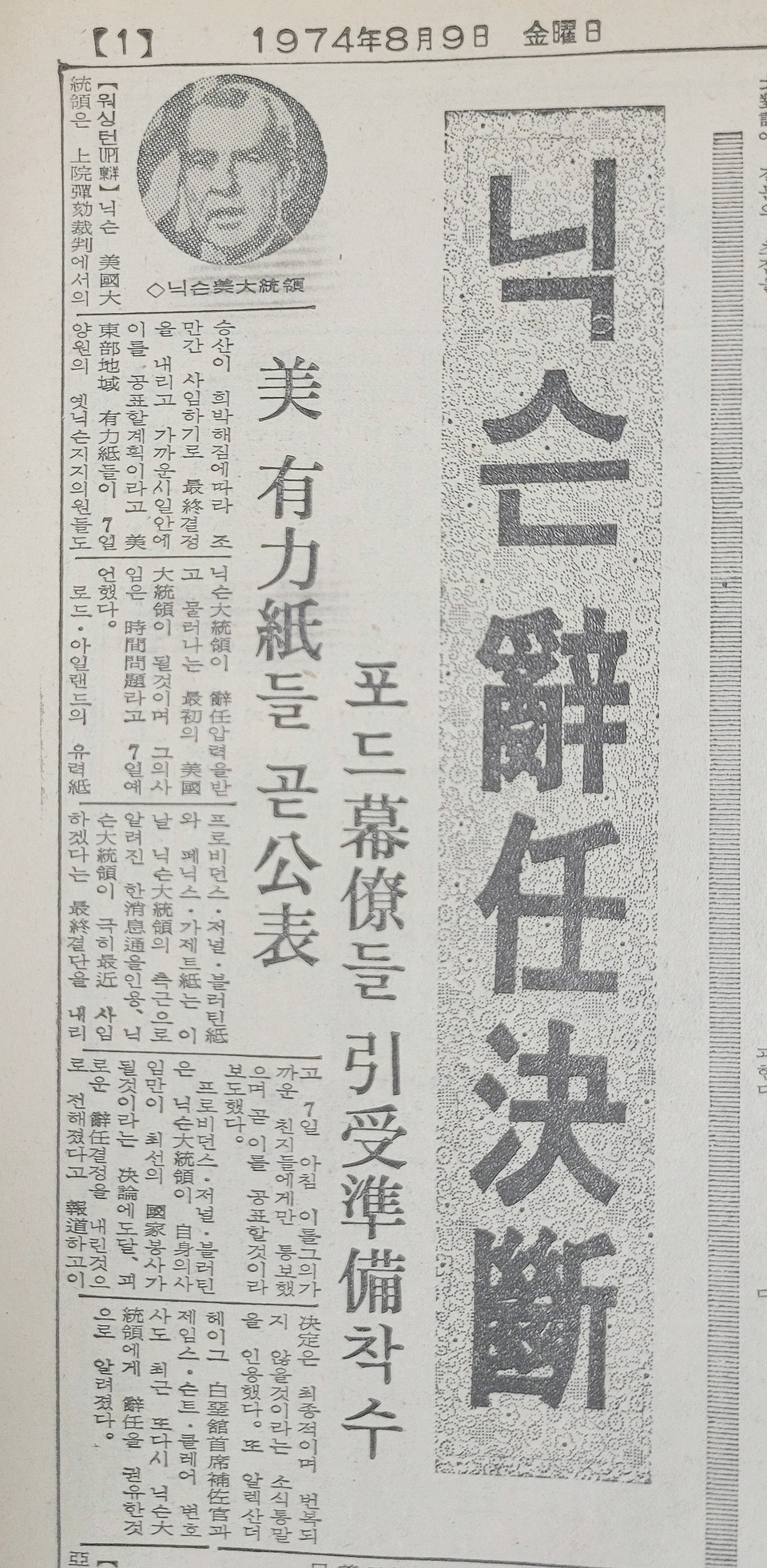 또 알렉산더 헤이그 白堊館(백악관) 首席補佐官(수석보좌관)과 제임스 슨트 클레어 변호사도 최근 또다시 닉슨 大統領에게 辭任을 권유한 것으로 알려졌다. <9065호·1974년 8월 9일자 1면>