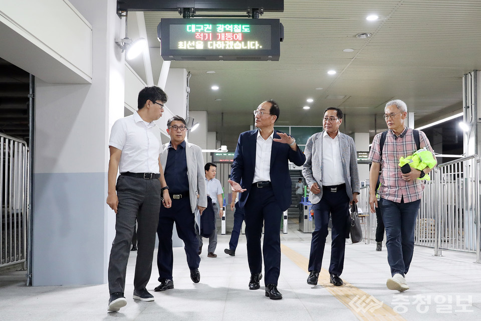 국가철도공단 이성해 이사장(사진 가운데)이 26일 대구권 광역철도의 주요 역사인 동대구역과 서대구역을 방문해 개통 준비 현황을 점검했다. 이 자리에서 이 이사장은 "비수도권 최초의 광역철도인 대구권 광역철도는 살기 좋은 지방시대를 여는 중요한 철도건설 사업"이라며 "마지막까지 안전과 품질관리에 만전을 기하고, 적기 개통을 위해 공정관리에 최선을 다해달라"고 주문했다. 대구권 광역철도는 오는 12월 개통을 목표로 하고 있으며, 현재 막바지 공사가 진행 중이다. 이달부터는 시설물 검증시험에 돌입해 철저한 준비를 이어가고 있다. /대전=이한영기자