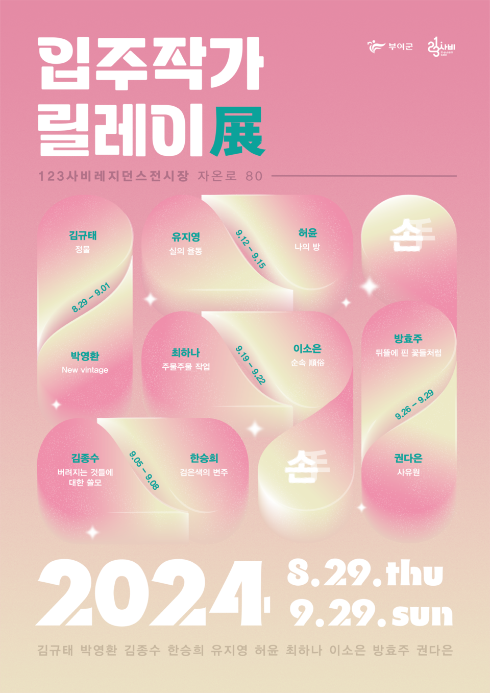 충남 부여군은 9월 29일까지 123사비창작센터 1기 입주작가의 릴레이 전시가 123사비레지던스 1층 전시장(자온로 80)에서 열린다고 밝혔다.