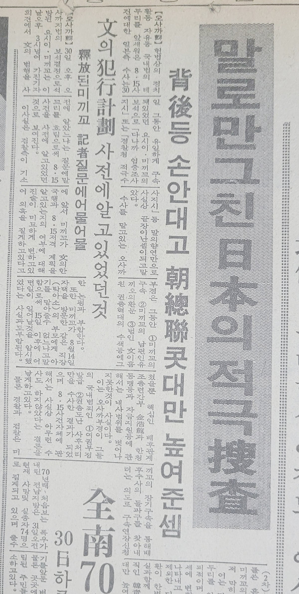 헌법상의 정치활동 자유 등 국내법의 테두리를 앞세워 온 8·15사건에 대한 일본 측 수사를 30일 그동안 유일하게 구속돼 있었던 요시이 미끼꼬의 보석으로 다나까 엄중수사 지시 또는 경찰청 적극수사 지시 등 말의 향연만으로 사실상 끝장난 셈이 되고 말았다.
