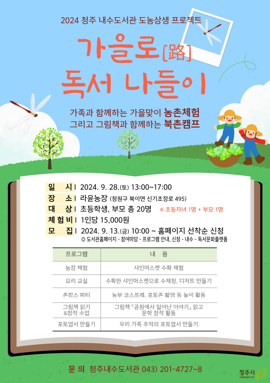 청주내수도서관은 오는 28일 청원구 북이면에 위치한 체험농장인 ‘라윤농장’에서 초등학생 가족을 대상으로 ‘촌캉스 독서캠프 프로그램’을 운영한다.