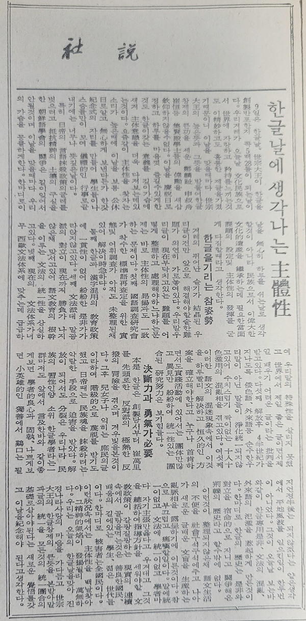 한마디로 이날을 無心히 하루를 쉬는 날로 생각할 것이 아니라 民族으로서 이 偉大(위대)한 文化的(문화적) 遺産(유산)을 繼承(계승)하는데 필요한 當面(당면) 課題(과제)의 設定(설정) 및 主體性의 發揮(발휘)를 굳게 다짐할 때라고 생각한다. (하략) <9118호·1974년 10월 10일자 2면>