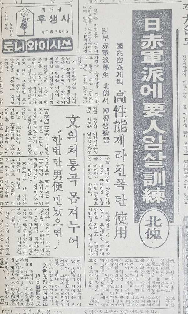 북괴는 악명 높은 일본 적군파 요원을 완전 고용하여 국내에 밀파, 8·15 저격사건과 같은 요인 암살을 기도하고 있음이 최근 확인됐다고 19일 고위 치안당국자가 밝혔다.