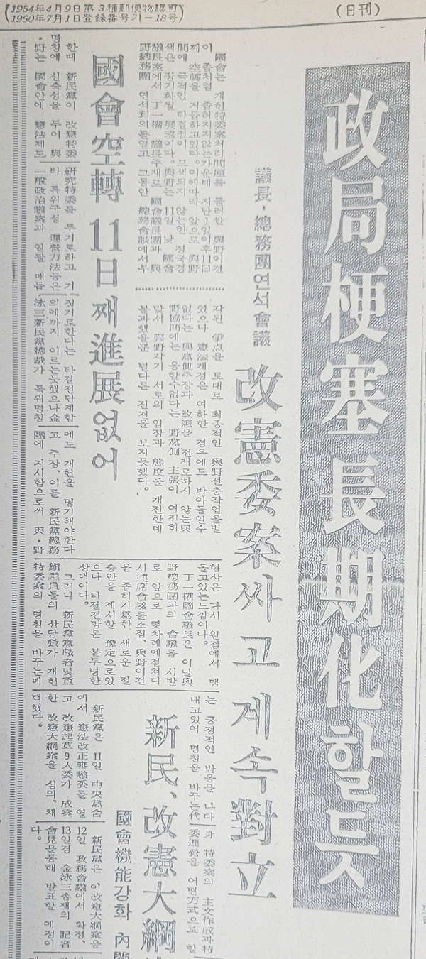 與野는 11일 낮 國會議長室(국회의장실)에서 丁一權(정일권) 議長(의장) 주재로 國會議長團(국회의장단)과 與野總務團(여야총무단) 연석회의를 열고 그동안 總務會談(총무회담)에서 부각된 爭點(쟁점)을 토대로 최종적인 與野 절충작업을 벌였으나 憲法(헌법) 개정은 여하한 경우에도 받아들일 수 없다는 與黨側(여당측) 주장과 改憲(개헌)을 전제로 하지 않는 與野 協商(협상)에는 응할 수 없다는 野黨側(야당측) 主張(주장)이 여전히 맞서 與野 각기 서로의 입장과 態度(태도)를 개진한 데 불과했을뿐 별다른 진전을 보지 못했다.