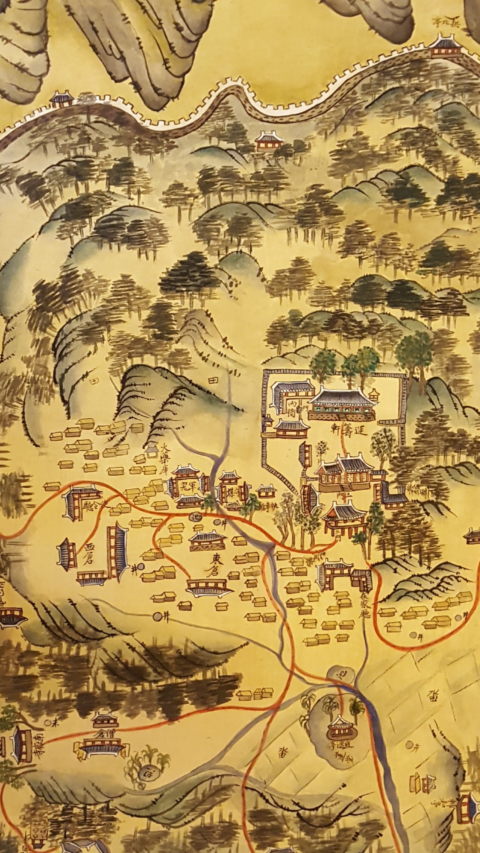 ‘상당산성도(上黨山城圖)’는 조선 후기 무신인 류억(1796~1852) 선생 때 제작된 것으로 알려졌으며, 청주 상당산성과 인근 낭성면의 모습을 한 눈에 볼 수 있어 역사적, 지리적 사료의 가치가 매우 높은 것으로 평가받고 있다. 상당이라는 명칭은 백제 때 청주의 지명인 상당현에서 유래한 것으로 알려져 있다. 최초 토성으로 만들어진 성을 조선시대 숙종 때 석성으로 개축하였다. 성 안에는 운주헌 등 관아와 서장대와 동장대를 비롯해 수첩군관청(守堞軍官廳), 재가군관청(在家軍官廳), 군기고(軍器庫), 화약고(火藥庫) 등 전시산성의 위용이 그대로 표현돼 있다.