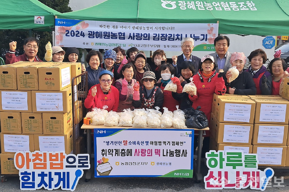 충북 진천군 광혜원농협(조합장 박봉식) 농가주부모임 회원 20여 명은 지난 20~21일 농협 주차장에서 김장김치(10kg 들이) 100박스를 담가 취약계층과 경로당 등에 전달했다.