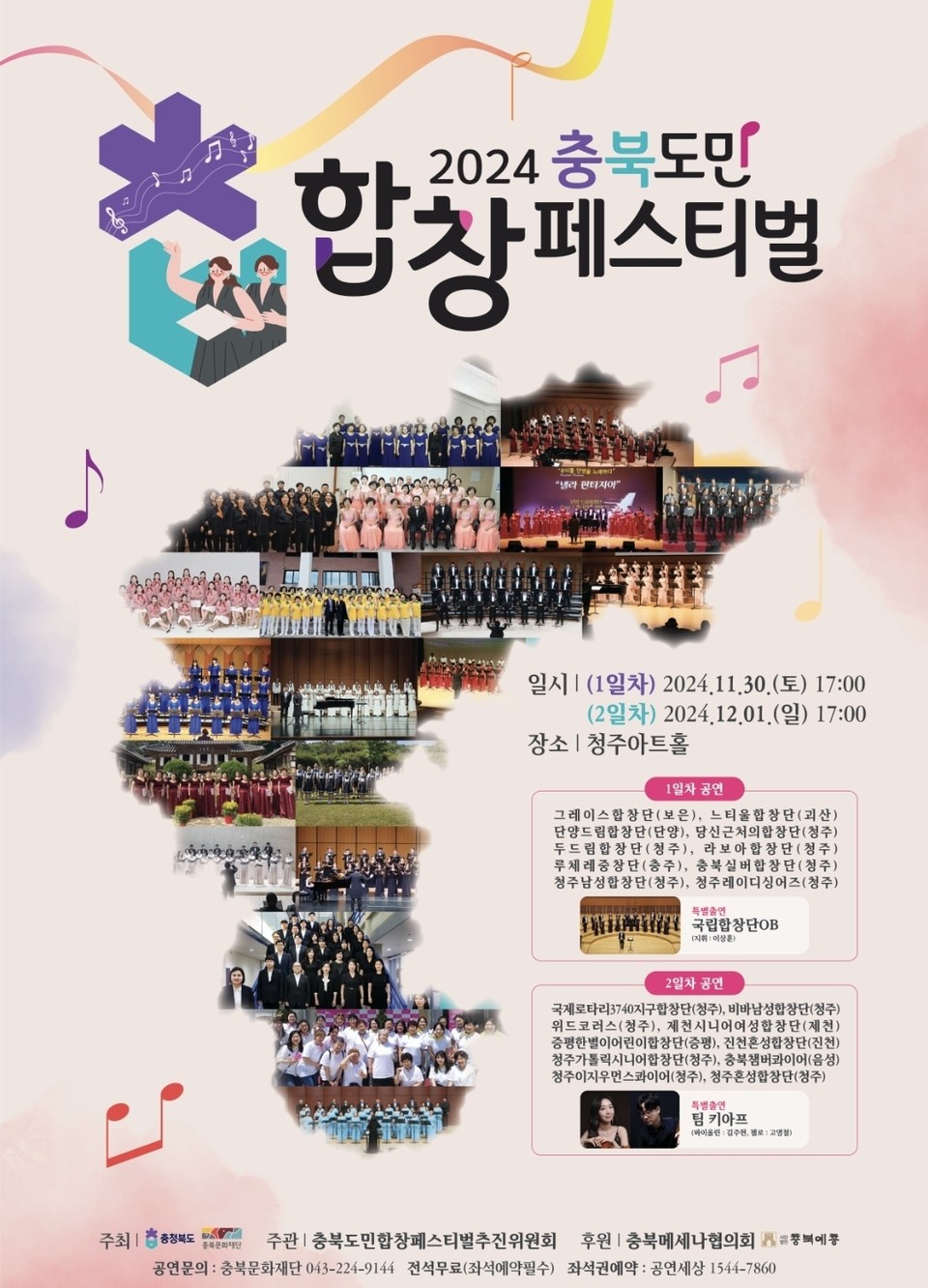 오는 30일에는 △당신 근처의 합창단 △보은 그레이스합창단 △충북노인종합복지관 소속 ‘충북실버합창단’ △서원대학교 라보아합창단 △두드림 합창단 △충주어린이 합창단 루체레 중창단 △청주남성합창단 △괴산 느티울 합창단 △청주레이디싱어즈 △단양 드림합창단 10개팀이 공연한다.