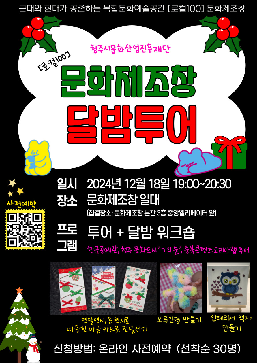 청주시문화산업진흥재단은 오는 18일 오후 7시 열리는 문화제조창 달밤투어 참여자를 모집한다.