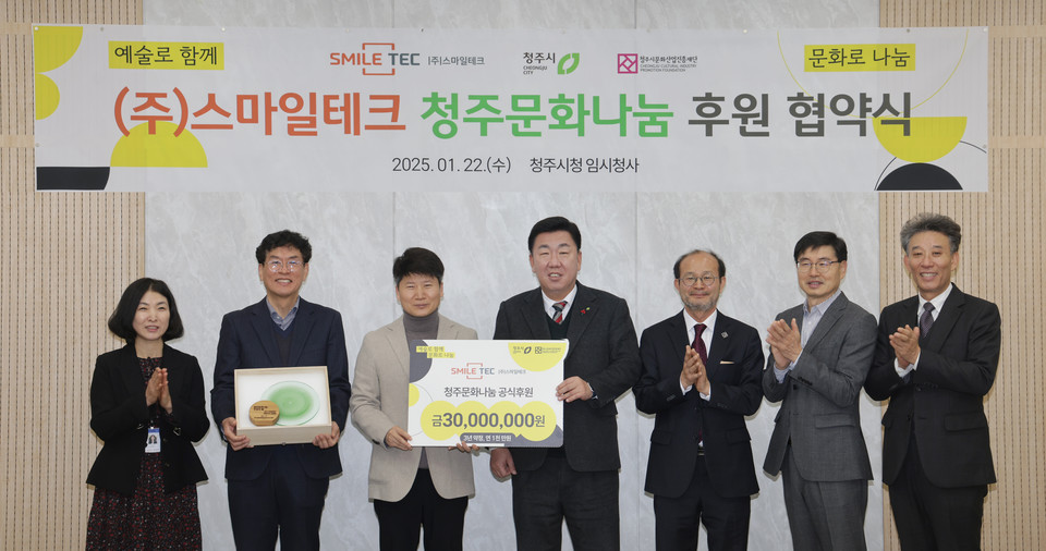 충북 청주시 청원구 내수읍에 본사를 둔 ㈜스마일테크가 청주문화나눔에 3년간 연 1000만원씩 모두 3000만원 후원하기로 약속했다.