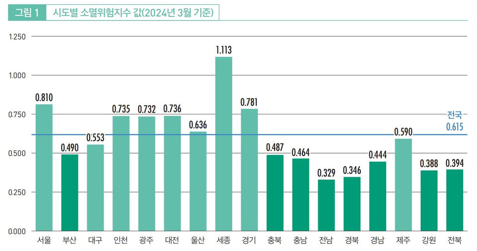 전국 평균은 0.615이며 광역 자치단체 17곳 중 부산시를 포함한 8곳이 소멸위험진입단계다.