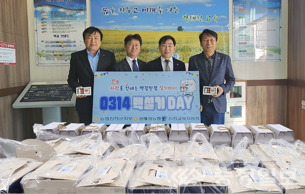 박봉식 광혜원농협 조합장(왼쪽부터)과 농협진천군지부 유호종 지부장 등이 지난 14일 충북 진천군 광혜원중학교에 화이트데이를 맞아 사탕 대신 우리 쌀로 만든 백설기 떡을 전달했다.