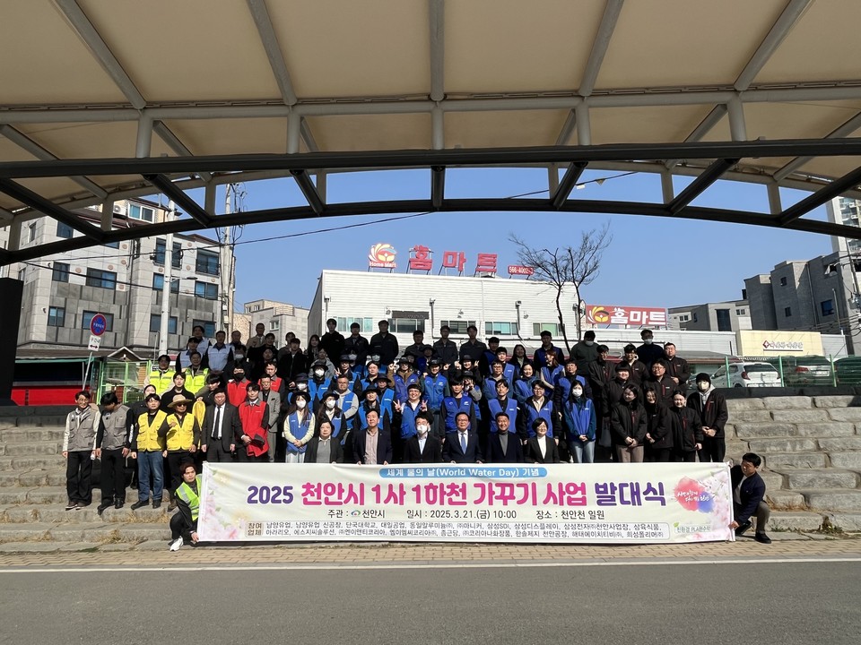 충남 천안시는 지난 21일 천안천 일원에서 세계 물의 날(3월 22일)을 기념해 '2025년 1사 1하천 가꾸기 사업' 발대식을 개최하고 하천 정화활동을 진행했다.