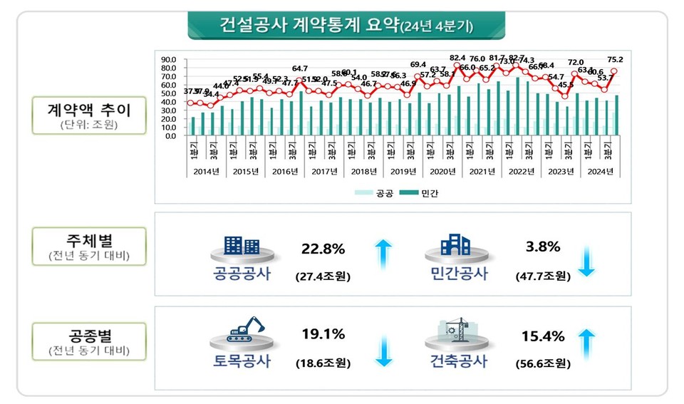 국토교통부가 30일 발표한 '2024년 4분기 건설공사 계약액'에 따르면 작년 4분기 계약액은