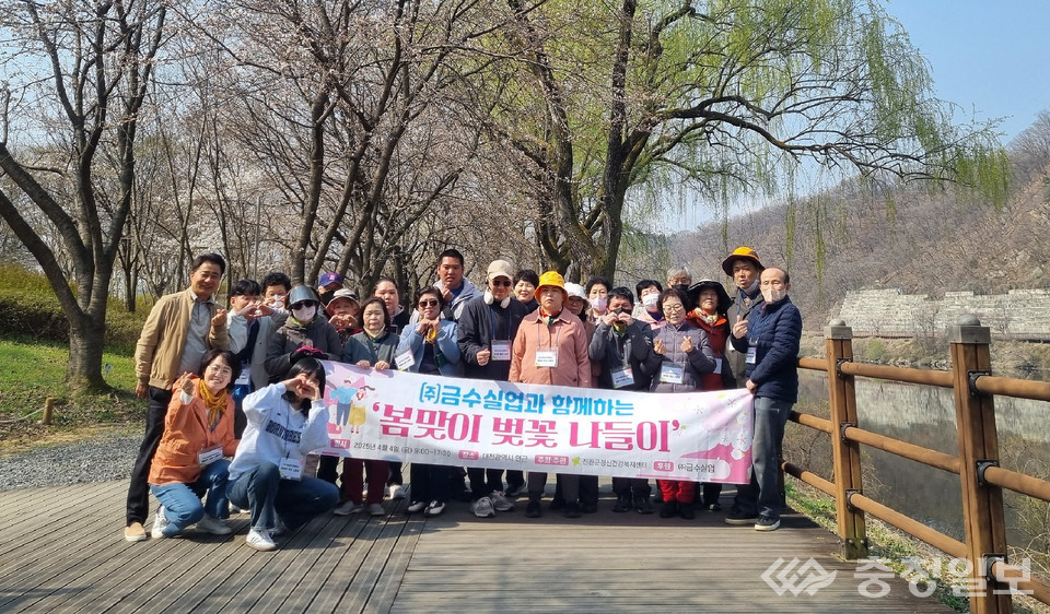 충북 진천군 정신건강복지센터는 등록회원과 가족 등 30여 명을 대상으로 지난 4일 ㈜금수실업 양근식 회장의 후원을 받아 대전시 금강로하스대청공원으로 ‘봄맞이 벚꽃 나들이’를 다녀왔다.
