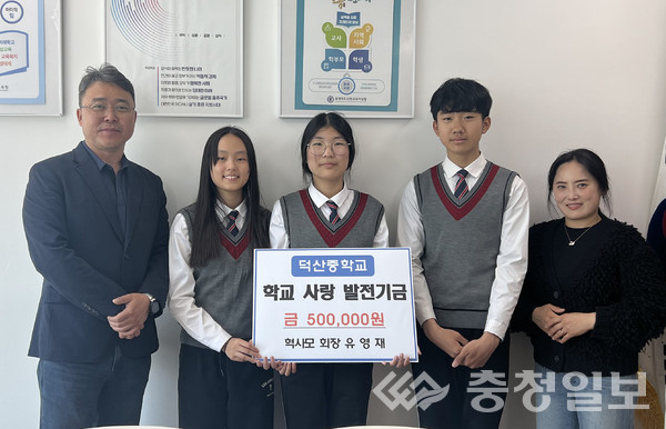 충북 진천음성지역 봉사단체 혁사모 유영재 회장이 지난 11일 덕산중학교에 학교발전기금 50만원을 전달했다.