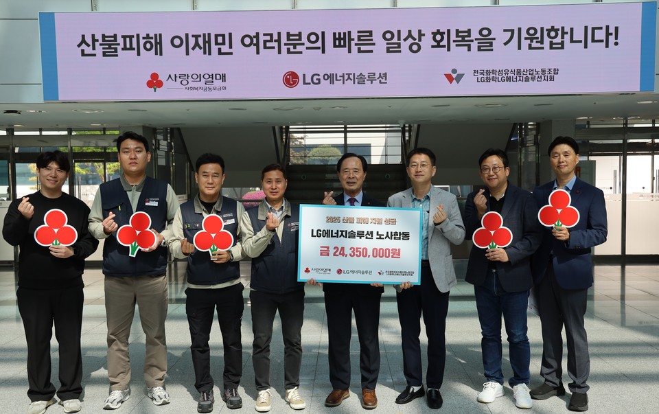 LG에너지솔루션 오창 에너지플랜트 노사는 24일 사상 최악의 산불로 피해를 본 영남지역 이재민들을 돕기 위해 성금 2435만원을 충북사회복지공동모금회에 전달했다. /김재옥기자
