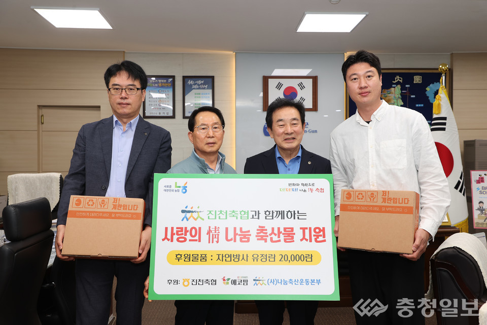 진천축협 박승서 조합장(왼쪽 두 번째)과 농업회사법인 에코팜(대표 석지훈), (사)나눔축산운동본부는 22일 충북 진천군청에서 송기섭 군수(〃 세 번째)에게 취약계층을 위해 유정란(1300만원 상당)을 기탁했다.