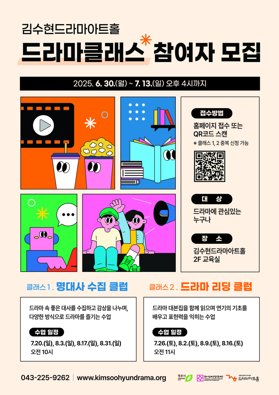 청주시문화산업진흥재단이 운영하는 김수현드라마아트홀이 오는 7월 13일까지 드라마 체험 프로그램 ‘드라마클래스’ 참가자를 모집한다.