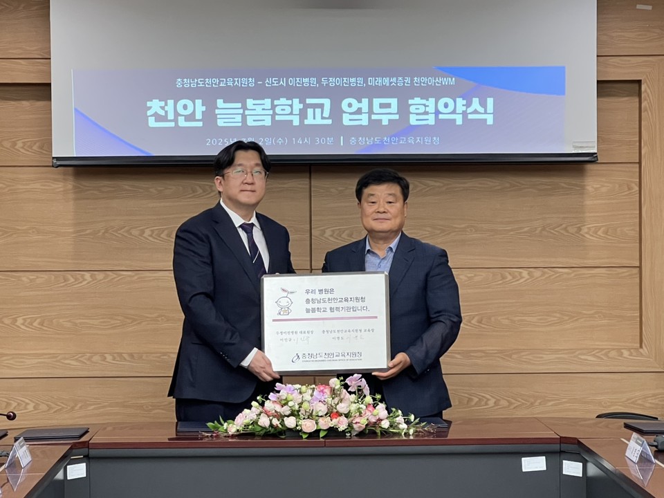 협약식은 신도시이진병원(대표원장 이혜경), 두정이진병원(대표원장 이인규), 미래에셋증권 천안아산WM지점(지점장 홍수오)이 참여했다.