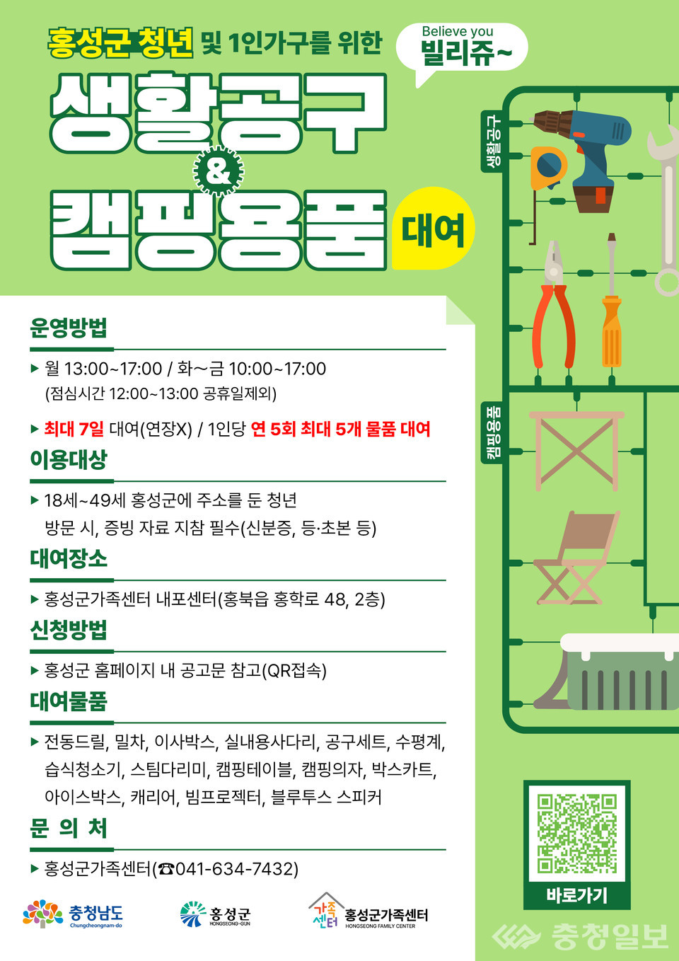 충남 홍성군이 관내 청년들의 생활비 부담을 줄이고 삶의 편의를 높이기 위해 '청년생활공구 대여 서비스(빌리쥬)'를 오는 10일부터 시작한다.