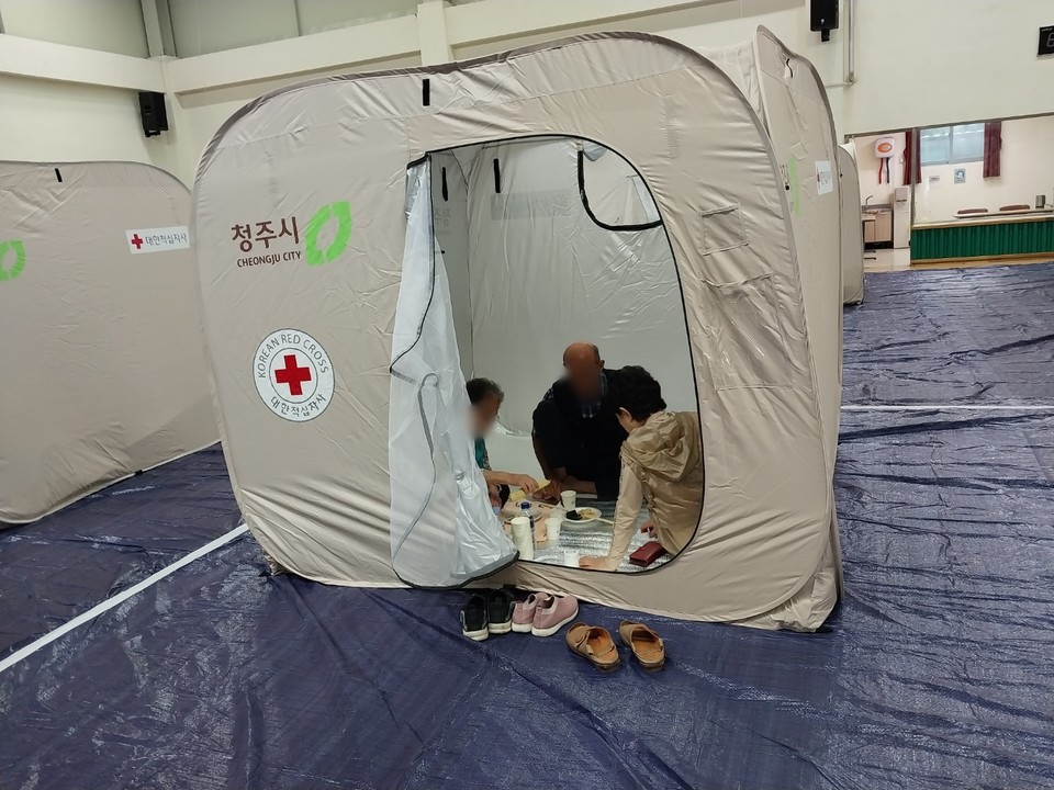 북이면 다목적체육관에 마련된 대피소에는 주민들이 쉴 수 있는 개별 텐트와 간단한 식음료, 구급상자 등이 갖춰져 있었다. 주민들에게 제공될 담요, 매트, 베개, 속옷 등이 담긴 응급구호 세트도 쉴 새 없이 채워지고 있었다.